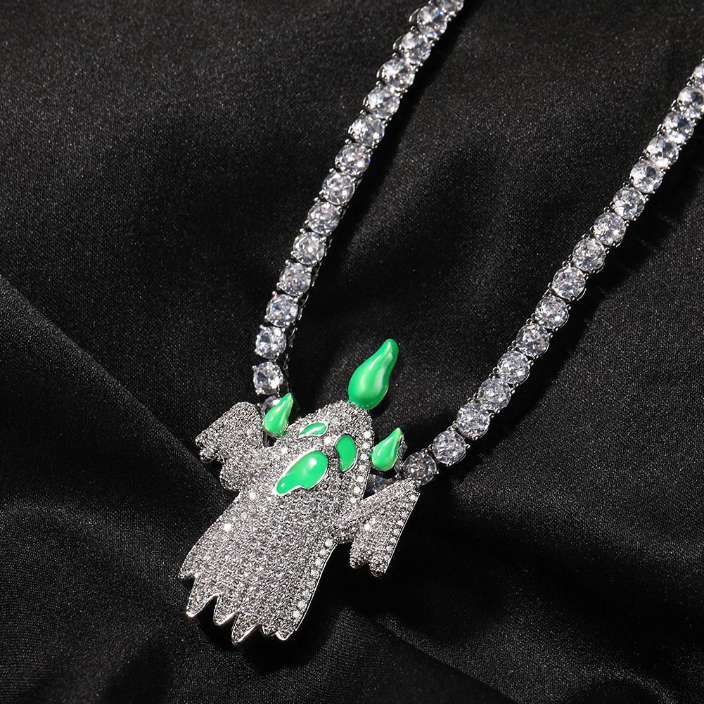 Available in both gold and silver finishes, the Icy Ghost Pendant pairs seamlessly with tennis chains or Cuban links, adding personality and energy to your hip hop look.