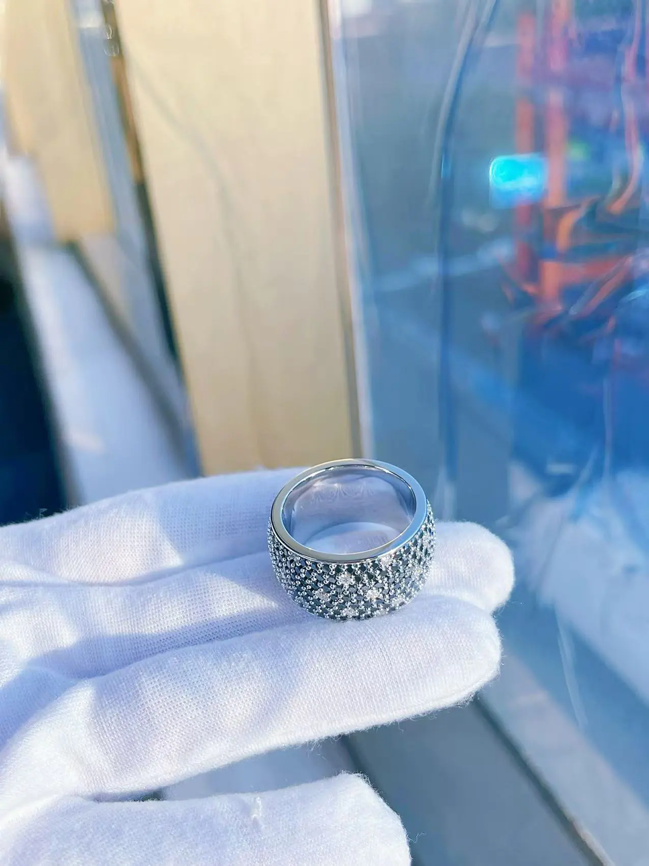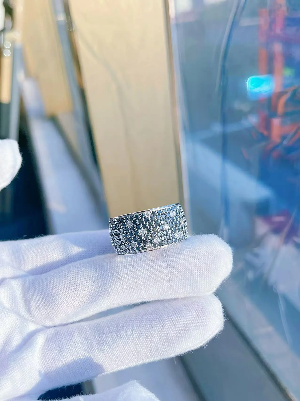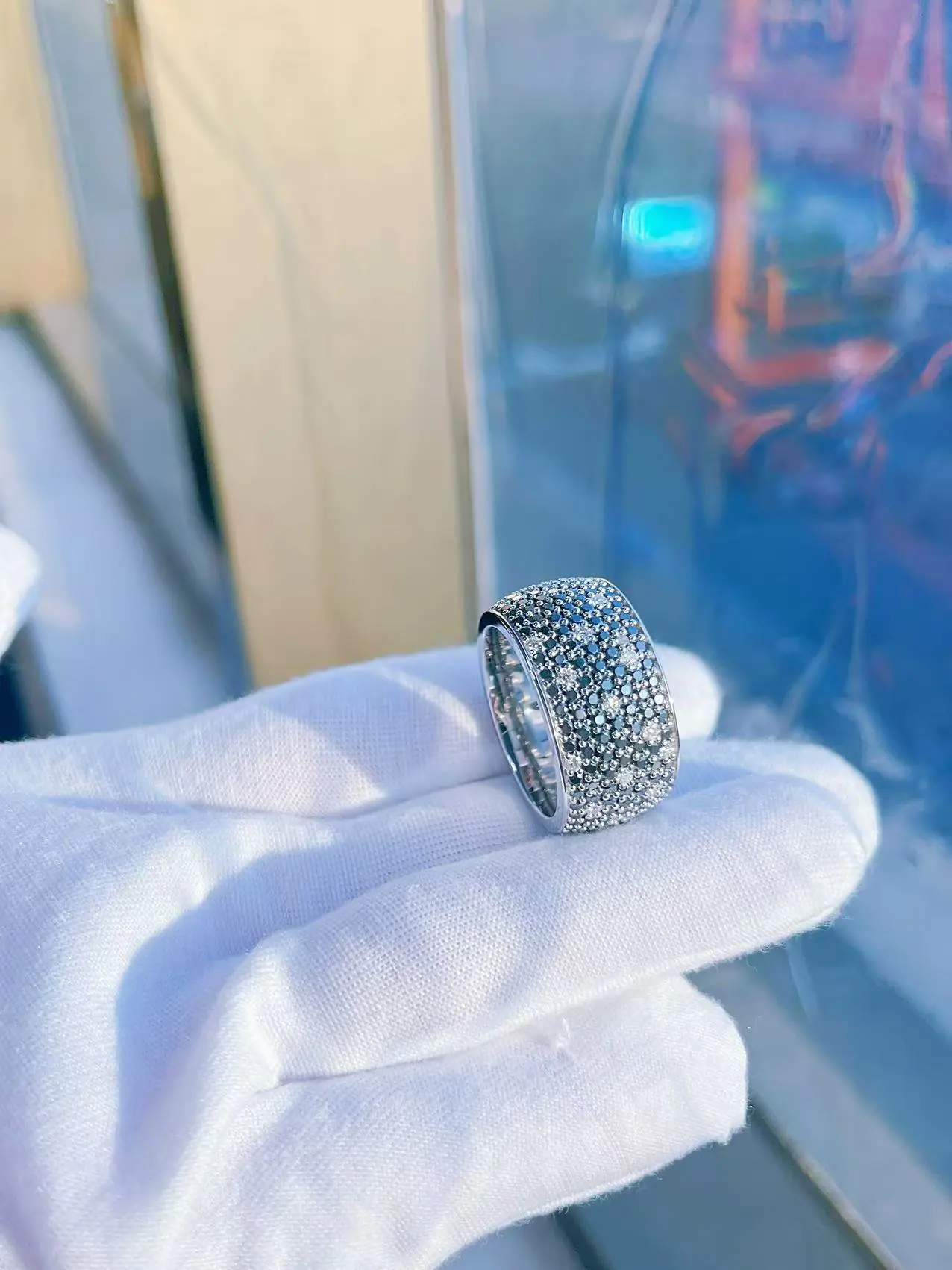 Each 925 silver moissanite pave ring is polished by hand, ensuring a smooth inner band and precise stone alignment. Every moissanite is GRA certified, offering true VVS clarity and diamond-like sparkle. The wide band design gives it a solid, high-end weight while maintaining a comfortable fit for daily wear.