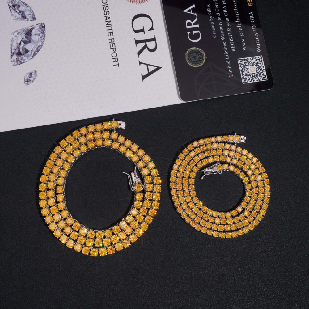 Thank you for reading this post, don't forget to subscribe!Crafted from 925 sterling silver and plated in 14K white gold, the chain stays bright while offering strong resistance to fading. Every stone is handset for a smooth, uniform surface, keeping the necklace flexible and comfortable. Whether you choose the 3mm or 4mm width, the light reflection from the yellow moissanite creates the same sparkle you’d expect from a high-end moissanite tennis necklace.